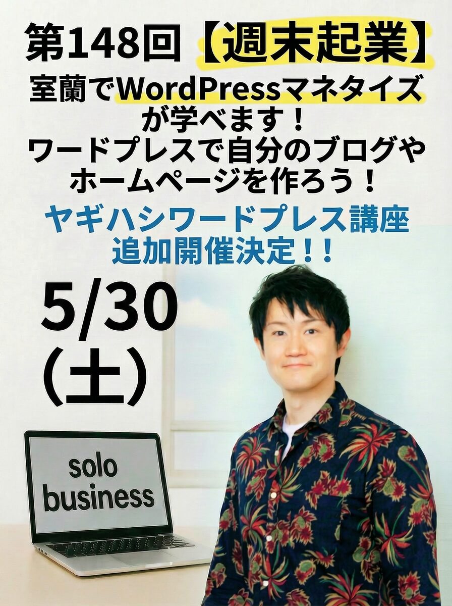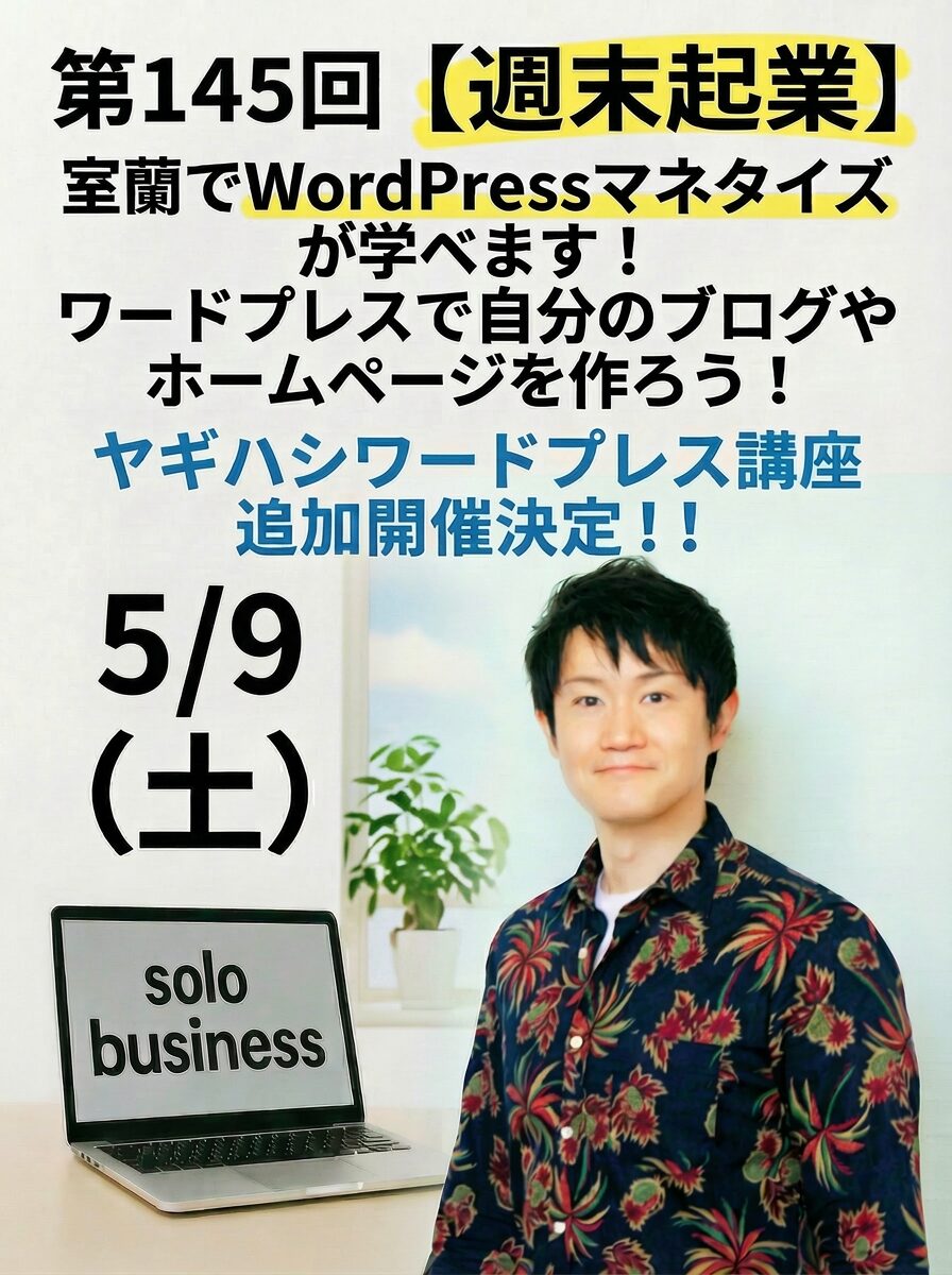 2026年5月23日(土)毎週土曜日【週末起業】室蘭でWordPressマネタイズが学べます。ヤギハシワードプレス講座 自宅サロン開催してます。 2026.04.11 WordPressマネタイズ ヤギハシ ヤギハシ ワードプレス講座