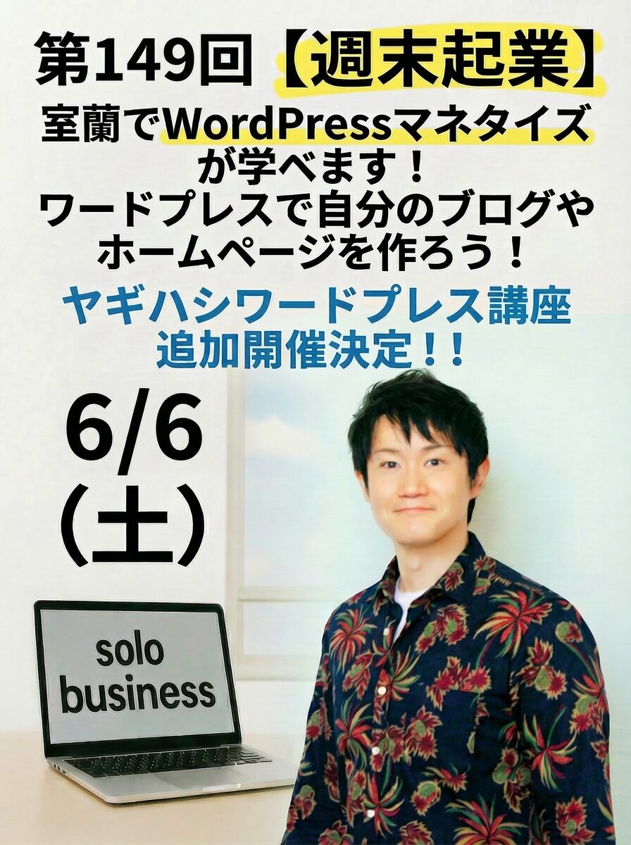 2026年5月30日(土)毎週土曜日【週末起業】室蘭でWordPressマネタイズが学べます。ヤギハシワードプレス講座 自宅サロン開催してます。 2026.04.11 WordPressマネタイズ ヤギハシ ヤギハシ ワードプレス講座