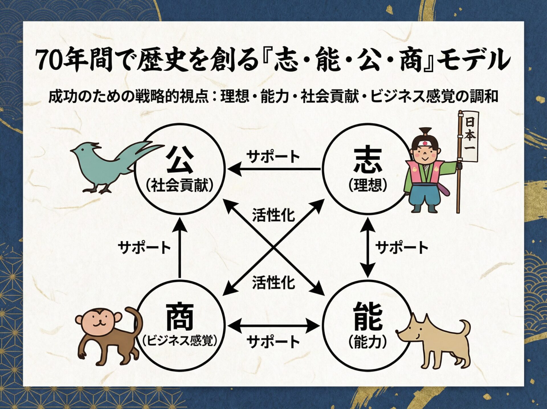 成功するためには、「志」(理想)、「能」(能力)、「公」(社会への貢献)、「商」(ビジネス感覚)をバランスよく持つ必要があるという戦略的な視点を紹介。