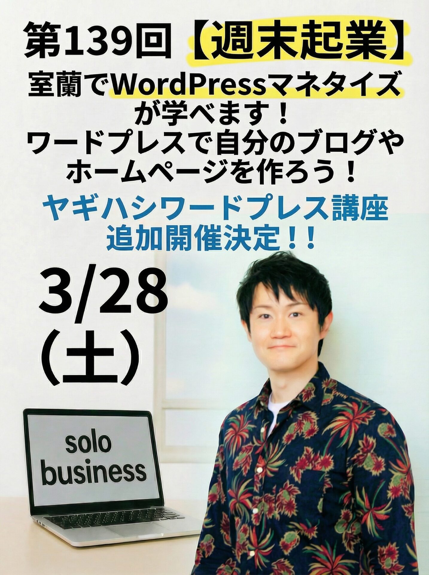 2026年3月28日(土)毎週土曜日【週末起業】室蘭でWordPressマネタイズが学べます。ヤギハシワードプレス講座 自宅サロン開催してます。 2026.02.14 WordPressマネタイズ ヤギハシ ヤギハシ ワードプレス講座