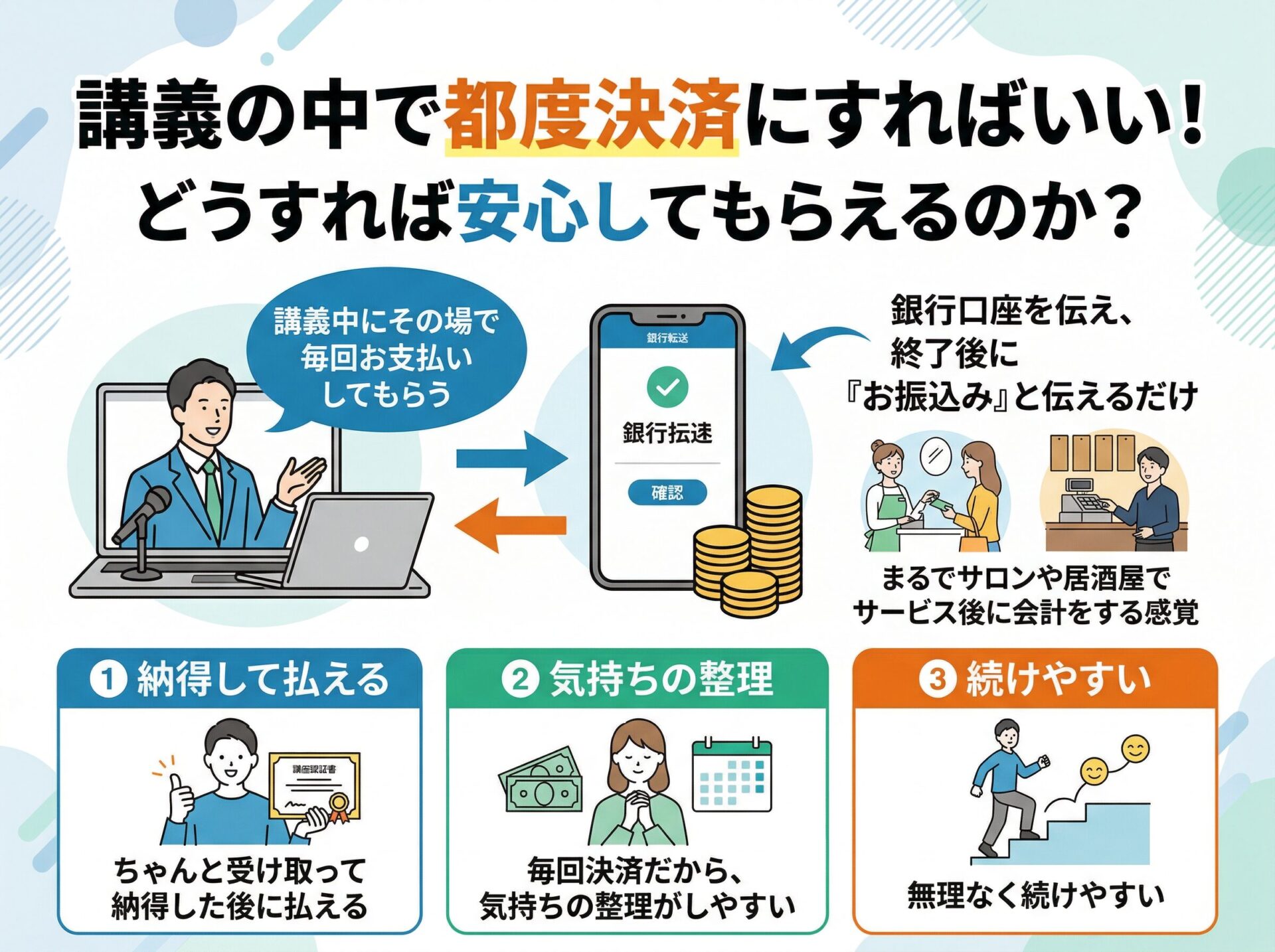 そこで 僕がやっているのは、「講義中にその場で毎回お支払いしてもらう」という方法です。