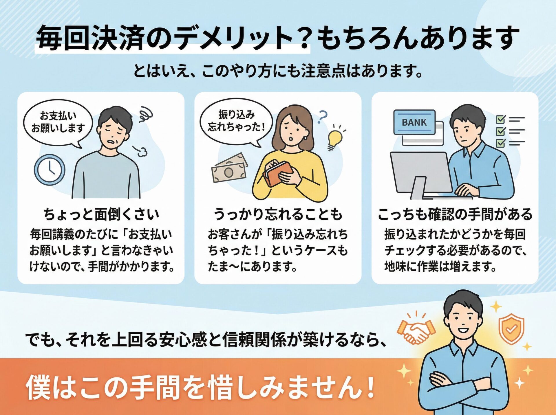 1. ちょっと面倒くさい  毎回講義のたびに「お支払いお願いします」と言わなきゃいけないので、手間がかかります。