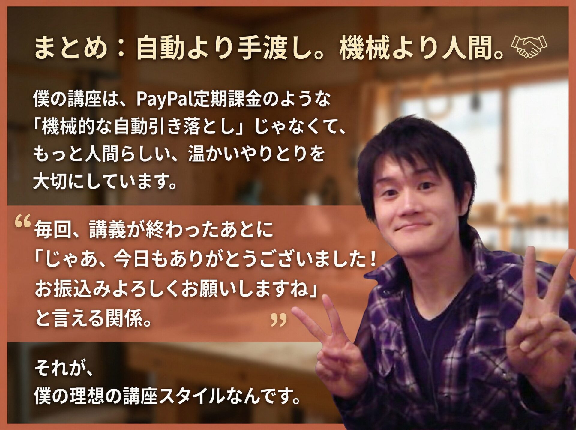 僕の講座は、PayPal定期課金のような「機械的な自動引き落とし」じゃなくて、もっと人間らしい、温かいやりとりを大切にしています。