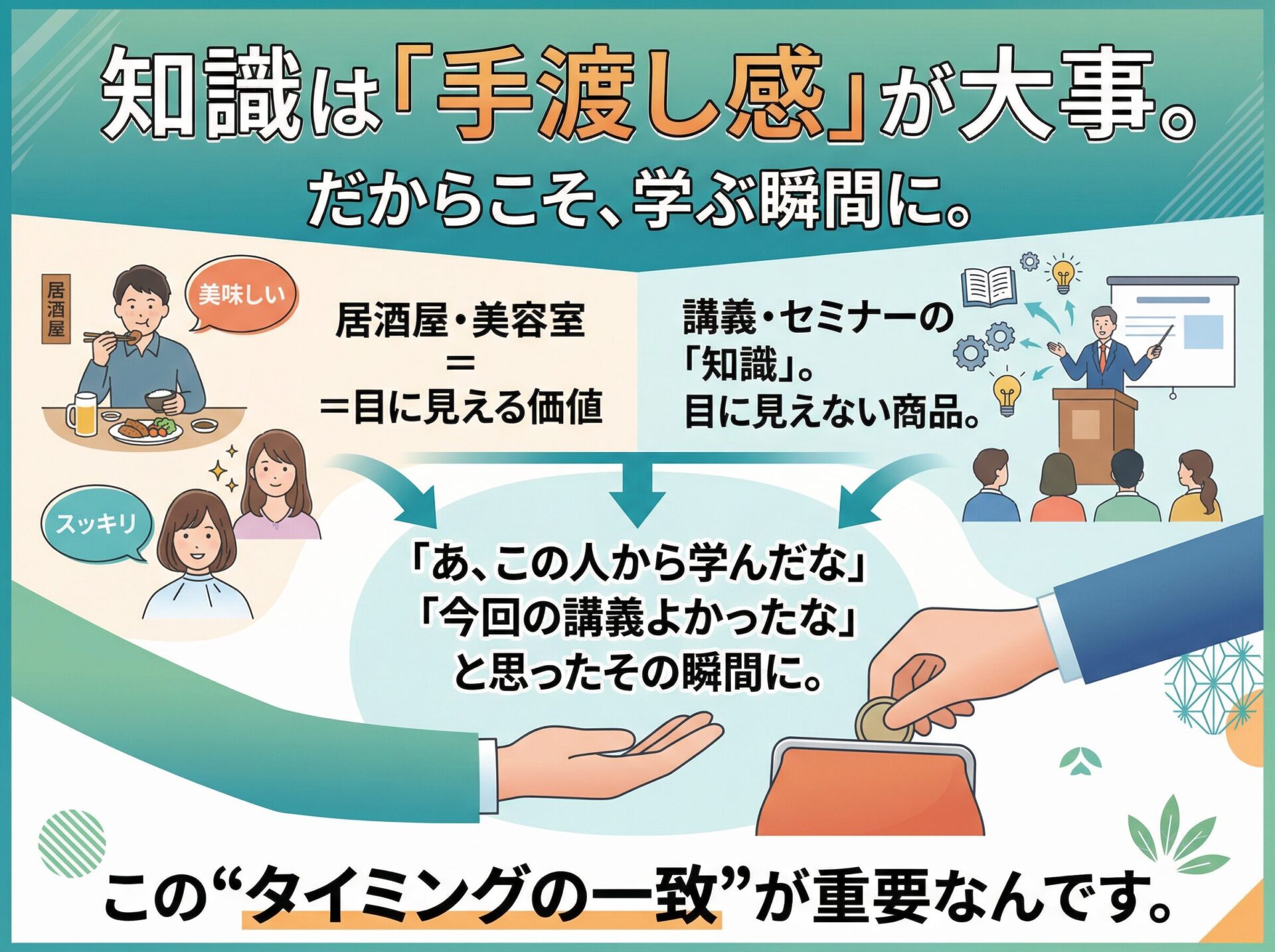 居酒屋はご飯が出てくるし、美容室は髪が切られてスッキリする。でも、講義って「目に見えない知識」が商品ですよね。